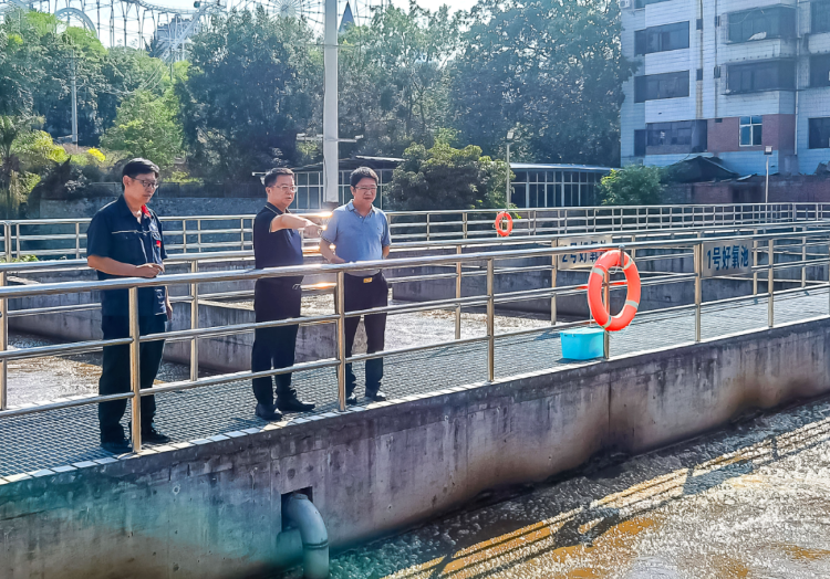 李楊董事長深入東城分公司炳草崗水廠、污水分公司大渡口污水處理廠生產(chǎn)現(xiàn)場,對現(xiàn)場防汛安全措施、邊坡?lián)鯄Α⒙毠し姥捶赖貫?zāi)教育培訓(xùn)情況、日常巡查維護記錄、環(huán)境安全管理、污水(泥)處置進行詳細了解。重點檢查了防汛物資供應(yīng)保障、汛期值班值守、高峰供水調(diào)度和生態(tài)環(huán)保、出水口水質(zhì)達標等工作。