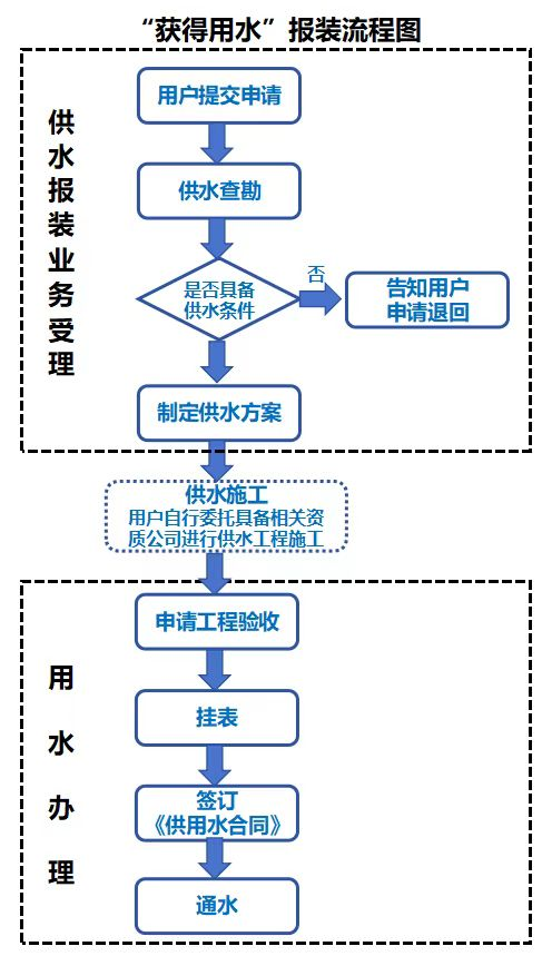 (一)供水報裝業(yè)務(wù)受理(2天):用戶提交申請、供水查勘、制定供水方案(如達(dá)不到給水要求及時以電話或書面方式給予用戶答復(fù));